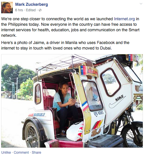 Mark posted a message on Facebook on the introduction of Internet.org in the Philippines through Smart: